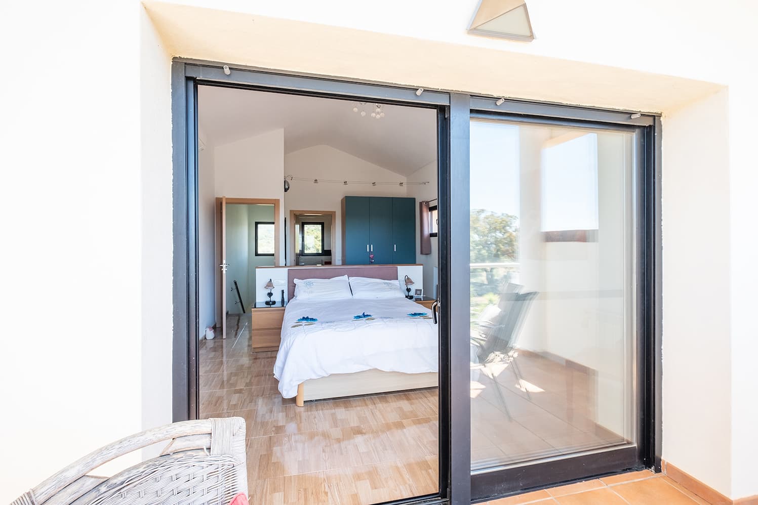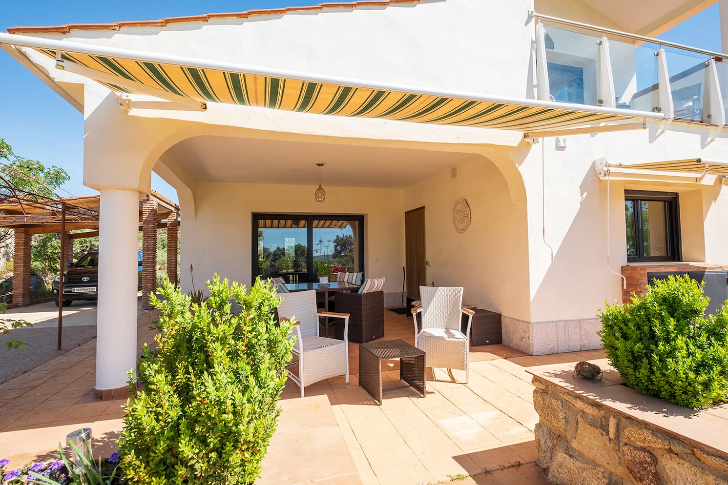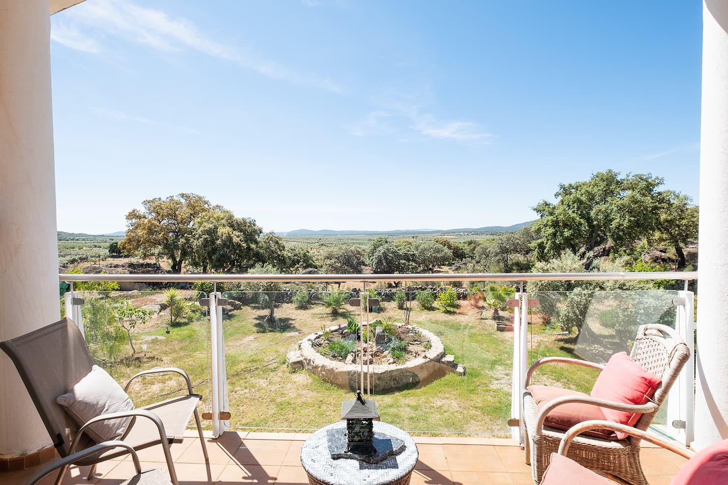 En la primera planta se encuentra la suite principal, con vestidor, armario triple y puertas correderas de cristal que dan a un balcón con espectaculares vistas al campo circundante y a la Sierra de Montánchez con su castillo; las vistas al cielo son magníficas. El dormitorio tiene un amplio baño en suite con ducha y toda la casa dispone de calefacción central de gasóleo. Las zonas ajardinadas están repletas de plantas y flores, incluyendo una gran fuente. Todas las zonas y terrazas están diseñadas para facilitar el acceso a personas con movilidad reducida.