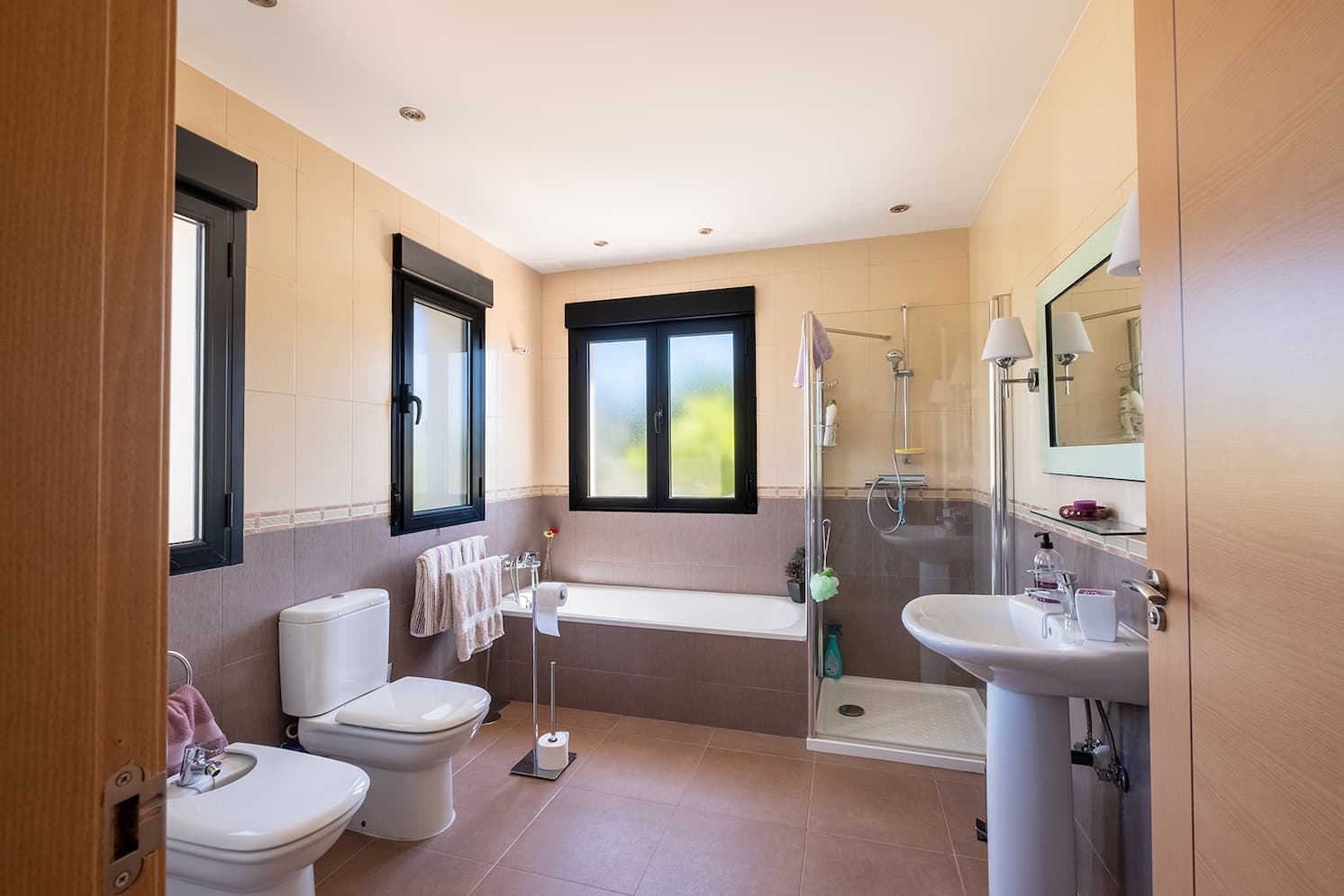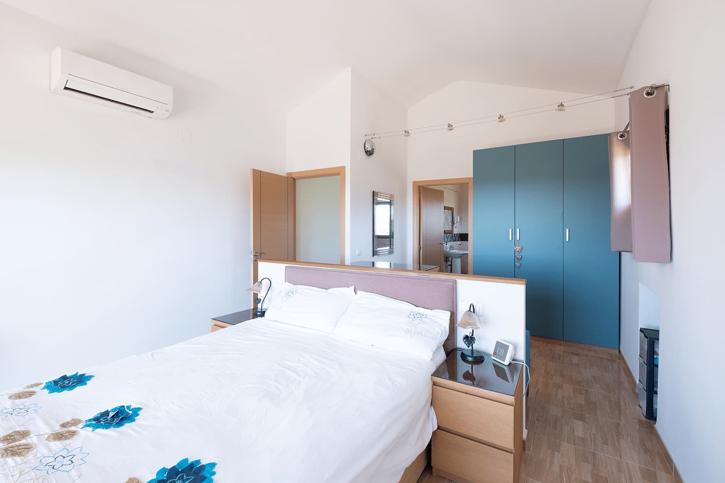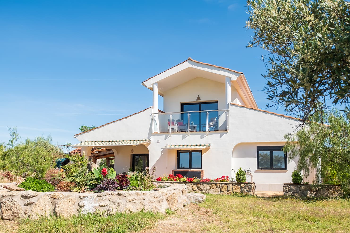 En la primera planta se encuentra la suite principal, con vestidor, armario triple y puertas correderas de cristal que dan a un balcón con espectaculares vistas al campo circundante y a la Sierra de Montánchez con su castillo; las vistas al cielo son magníficas. El dormitorio tiene un amplio baño en suite con ducha y toda la casa dispone de calefacción central de gasóleo. Las zonas ajardinadas están repletas de plantas y flores, incluyendo una gran fuente. Todas las zonas y terrazas están diseñadas para facilitar el acceso a personas con movilidad reducida.
