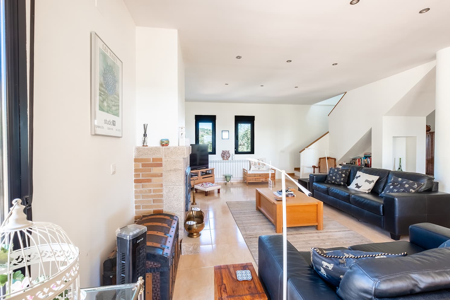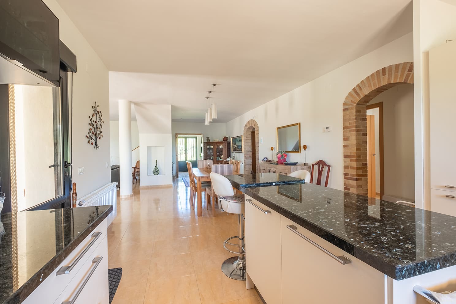 VIVIENDA: La planta baja consta de una amplia cocina abierta con encimeras de granito y una isla, además de una barra americana para dos personas. Todos los electrodomésticos integrados, como lavadora, lavavajillas, frigorífico-congelador, horno, placa de cocina y campana extractora, están incluidos en el precio de venta. Junto a la moderna cocina de color crema, compuesta por numerosos muebles bajos y altos, se encuentra un espacioso salón con estufa de leña. Ambas estancias cuentan con ventanales que permiten la entrada de abundante luz natural. Un amplio pasillo conduce a dos amplias habitaciones dobles con un armario doble cada una y un baño familiar más grande de lo habitual con ducha independiente y armario.